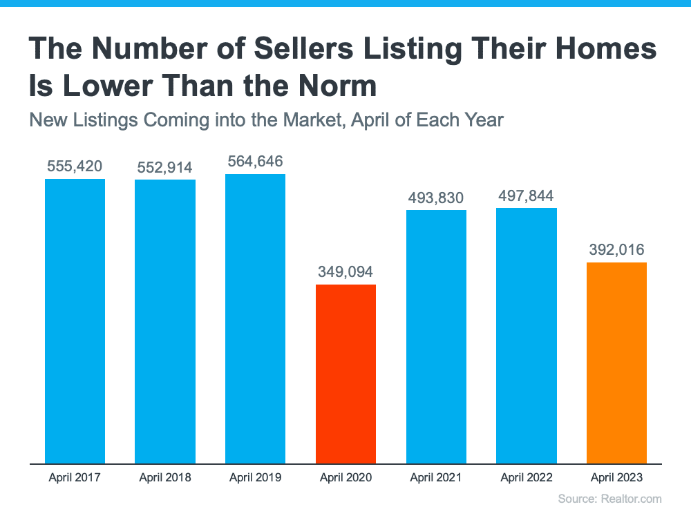 The current number of homes for sale is significantly lower than in years past. Looking back at every April since 2017, the only year when fewer sellers listed their homes was in April 2020, when the pandemic hit and stalled the housing market (shown in red in the graph below). In more typical years, roughly 500,000 sellers add their homes to the market in April. This year, we saw fewer than 400,000 sellers entering the market in April (see graph below):